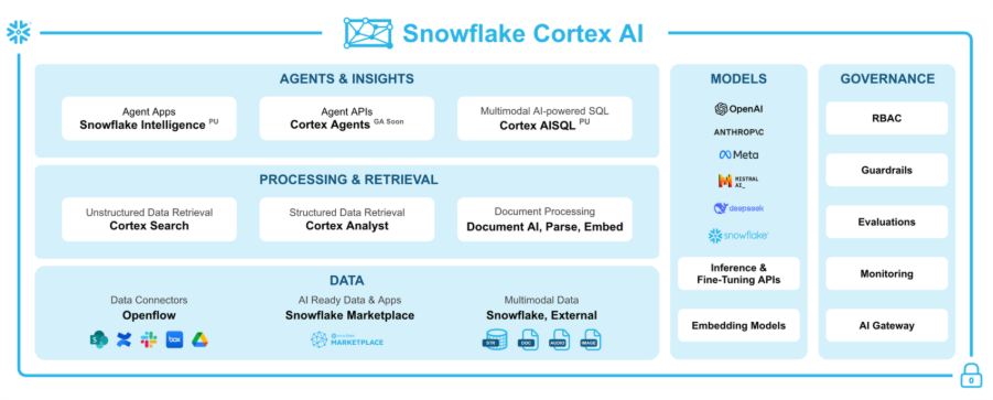 - Cortex Analyst: A conversational AI interface that converts natural language questions into accurate SQL queries, enabling business users to access insights instantly.